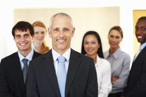 Portrait of confident multi racial business people smiling together at office